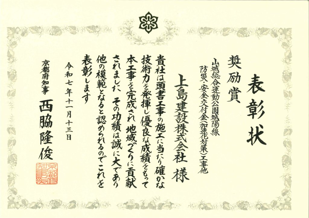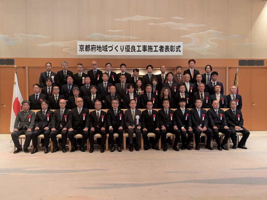 この度、当社は京都府知事 西脇隆俊様より令和6年度「京都府地域づくり優良工事施工者表彰」奨励賞を受賞いたしましたのでご報告いたします。